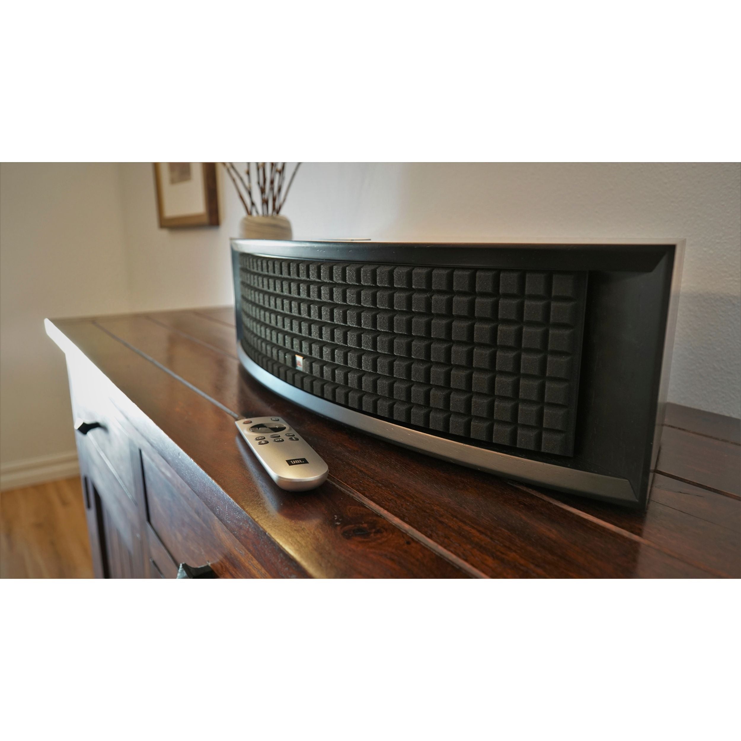 Bag det ikoniske JBL Quadrex-gitter gemmer sig et par dobbelte 4-tommers (100 mm) woofers og dobbelte 0,75-tommers (20 mm) aluminiumsdometweeters med bølgeledere, der er placeret til venstre og højre for at skabe et bredt og jævnt lydfelt. Det slanke kabinet er designet med afrundede kanter og fås i klassiske JBL-ægte træfinér i farverne Sort Valnød eller Naturlig Valnød, hvilket tilføjer en elegant finish til ethvert rum.