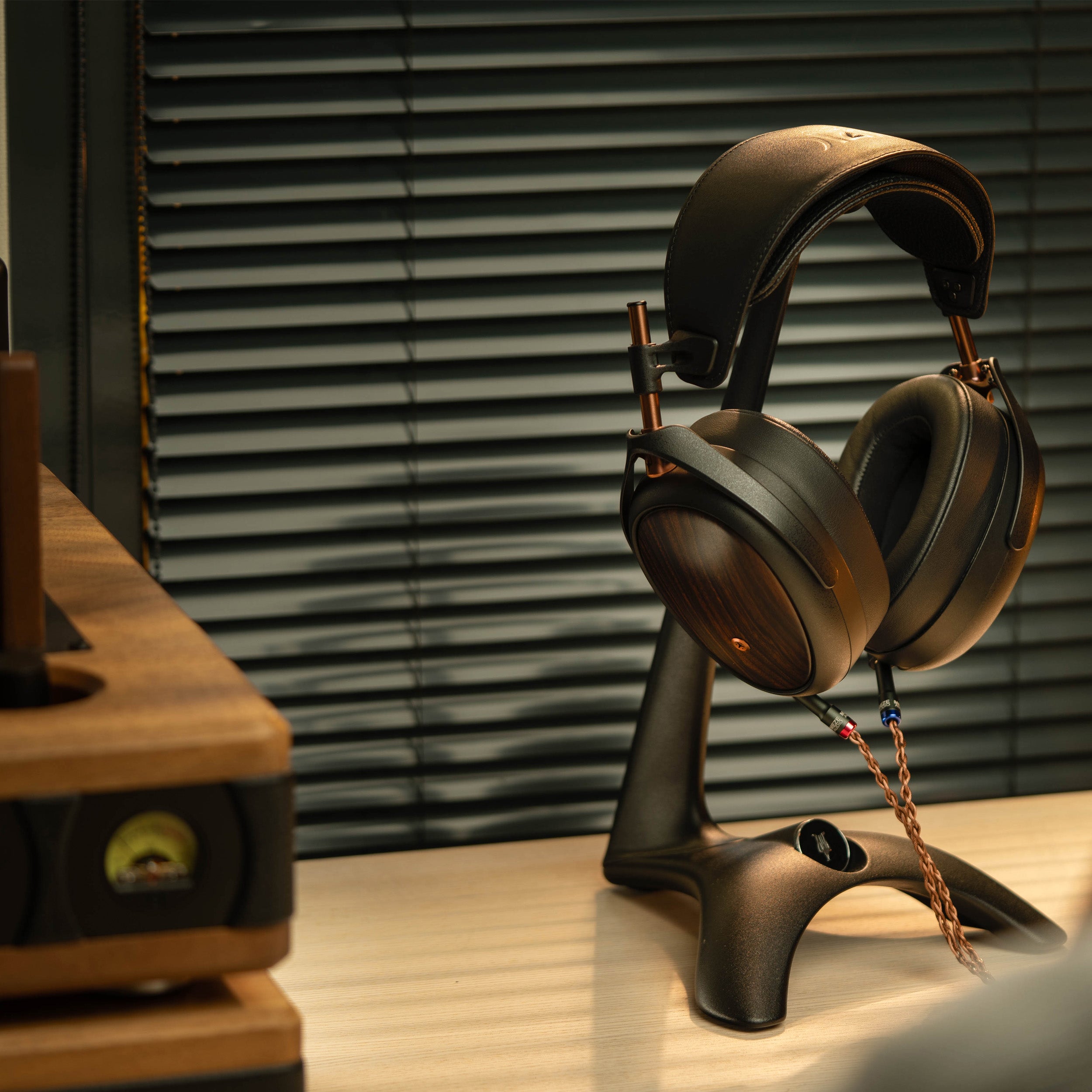 En kombination af læder, metal og træ – modstandsdygtig mod slid, chok og oxidation. Let, fleksibel og designet til lange lytteperioder.