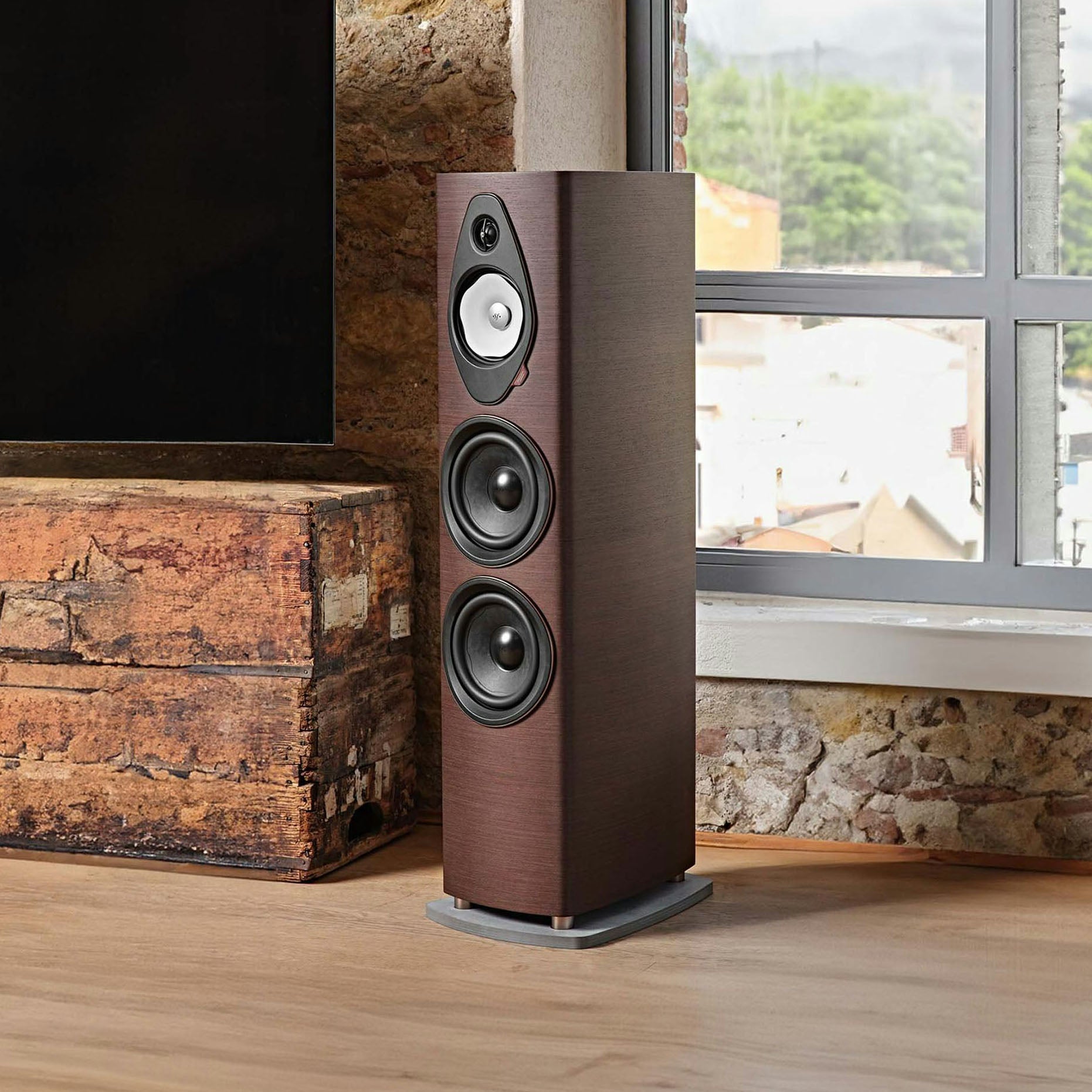 Med sin åbne poretræ-finish fremhæver Sonetto VIII G2 træets naturlige skønhed og giver en taktil og visuelt tiltalende tekstur. Denne finish forstærker højtalernes organiske følelse og skaber en harmonisk blanding af æstetik og håndværk, der passer perfekt ind i ethvert stilrent hjem. Den nye betonbase forbedrer stabiliteten og den strukturelle integritet af højtaleren, hvilket minimerer vibrationer og sikrer optimal ydeevne, især i krævende lytteomgivelser.